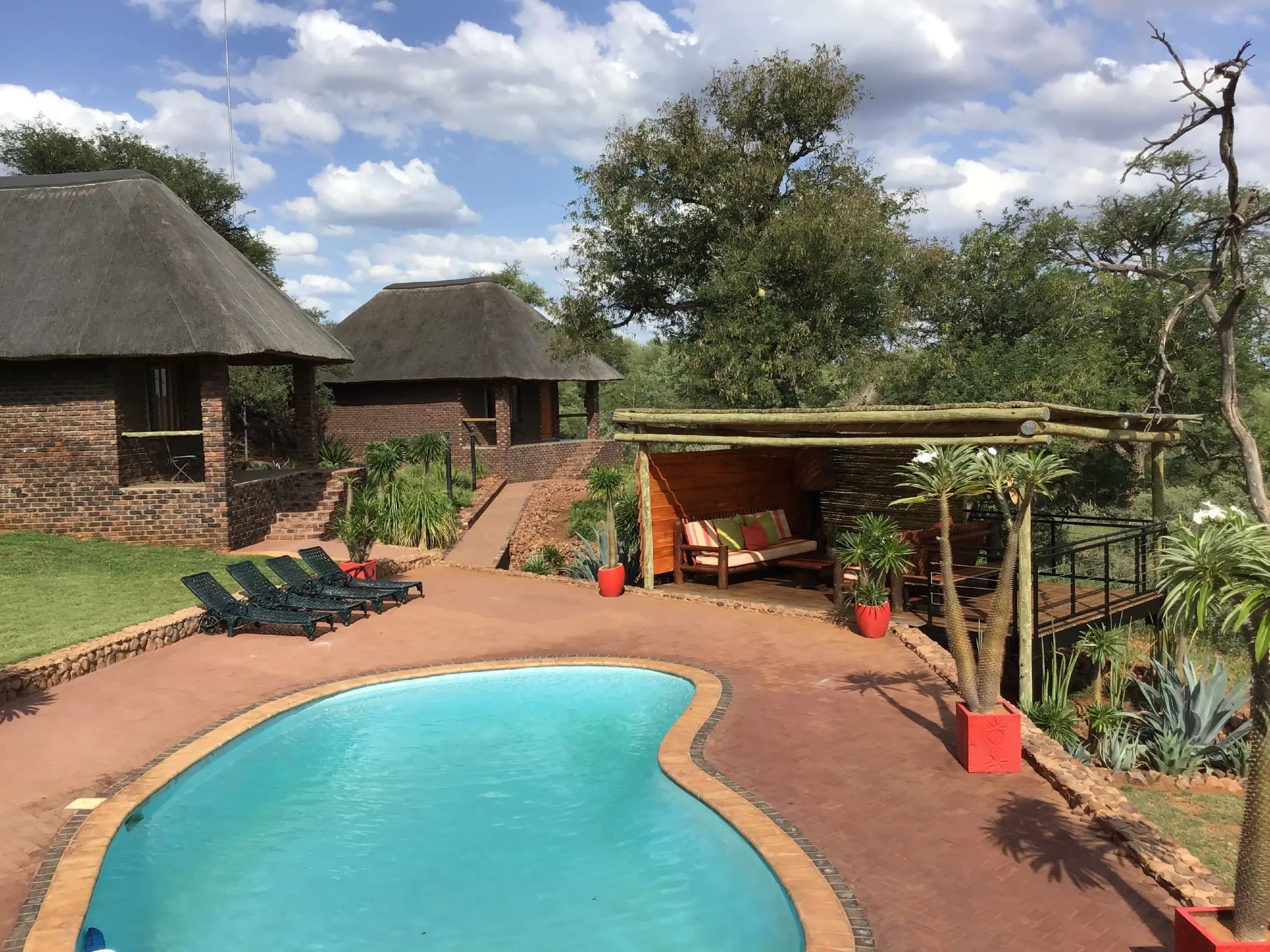 The swimming pool area invites guests to enjoy the sun and swim after a full day of hunting.