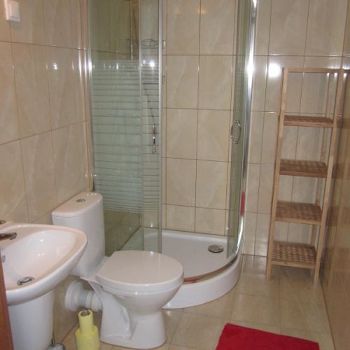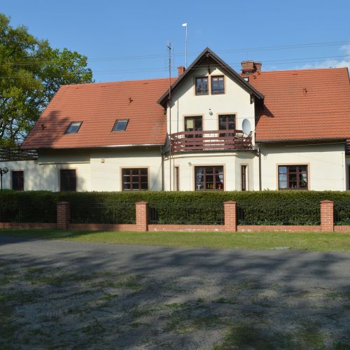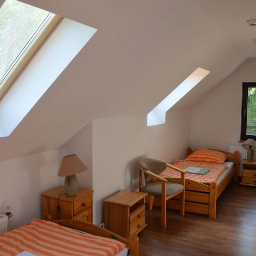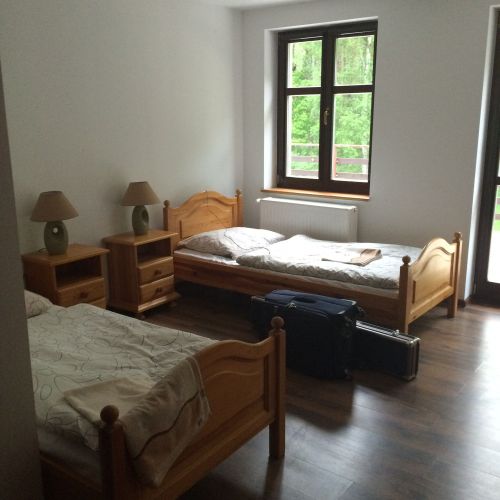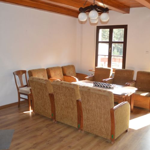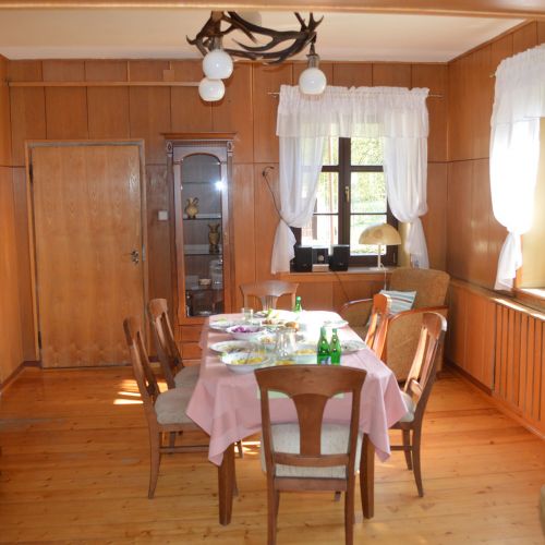 Accommodation is provided in the district's hunting lodge, located in peaceful surroundings within the forest. The guest area on the first floor includes a room with a fireplace, five double rooms, one triple room, and one single room. Most rooms have a private bathroom. A refrigerator is available for guests, and there is access to a locked garage and a cold storage room. The lodge offers Wi-Fi and mobile coverage.