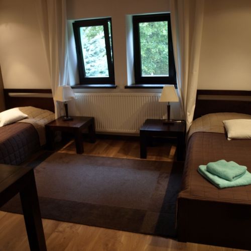 Accommodation is provided in a hunting lodge located deep in the forest, offering a peaceful setting with the nearest neighbor 2 km away. Hunters visiting the Zlotoryja district also stay here. The guest area on the first floor includes a cozy lounge, six double rooms, and one three-bed room. All rooms have private bathrooms. A refrigerator is available in the lounge, and guests have access to a secure garage and a game cooler. The head of hunting operations in Legnica is Remigiusz Baran, who speaks some German. Wi-Fi and mobile coverage are available.