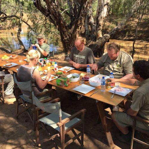 This is a real wilderness adventure, with the camps built in the most beautiful surroundings, often next to a river where you can sit and watch the animal life. Every year camps are set up in areas, depending on the season, where many buffalo are present. The camp consists of 4-5 large tents each of which can house 2 camp beds. It is easy to stand upright in the tents, and there are no small tents that would be uncomfortable for 2 people. It is of course possible to request that hunters have a tent to themselves, if the group is not too large. All meals are served in the open air. There are tables and chairs set up next to the camp kitchen, which is set up as an extension of the tents. Surprisingly good, well prepared and drinks are served in camp. It must be said the camps are rather remote, with no town  or even other people within a radius of many kilometers. First aid treatment is available in camp, but if anything more acute occurs, there is a small medical post in Bulman, which is a  1-2 hour drive from the hunting camp.