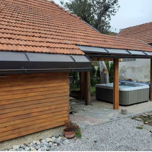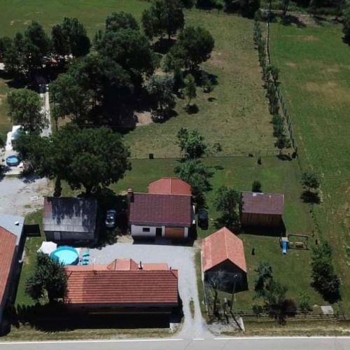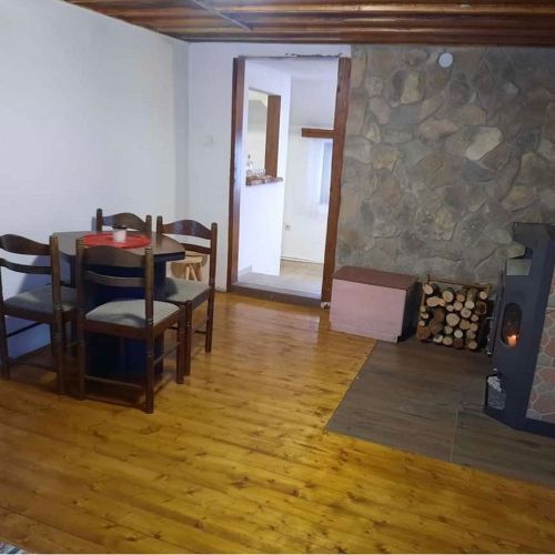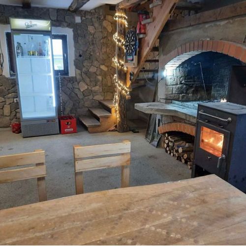 The ground floor consists of 7 beds, living room, 2 toilets, kitchen, kitchen family room, sauna and fireplace. The upper floor has 3 beds, living room, toilet and kitchen, as well as a separate banquet hall with large fireplace and outdoor spa.