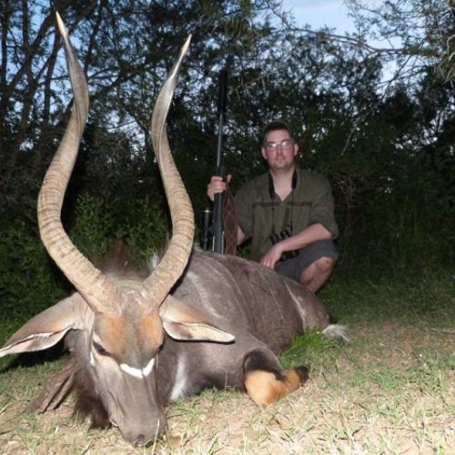 Freddy carefully raised his head over the edge. Less the 70 meters in front of him the young bull was still grazing peacefully. Freddy slowly looked to the right and there – only 15 meters in front of him – the old bull was feeding towards us! Freddy ducked in slow motion and whispered as silent as he could that I should move around him and kill the bull in front of us. I managed to get around him in slow motion and I raised the rifle as I looked over the top. But we were busted - A nyala does not grow ears the size of a saucer for the fun of it!
