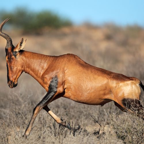 Scientific Name: Alcelaphus b caama Subspecies: Is itself a subspecies of Alcelaphus buselaphus. Distribution: South Africa, Namibia, Botswana and Angola Habitat: Open grassland and savanna. Description: Middlesized antelope, that weighs around 170 kg and measures 120 - 140 cm over the shoulder. General colour light reddish brown. The horns are black and heavy, curved at first slightly...