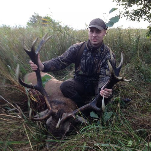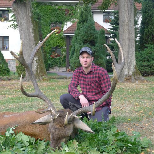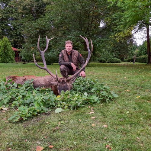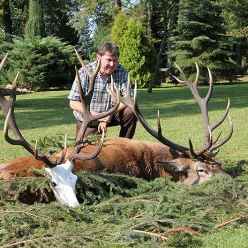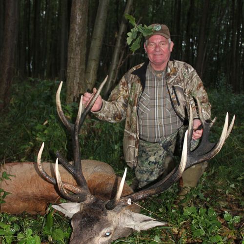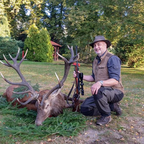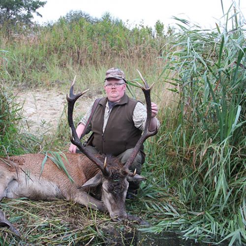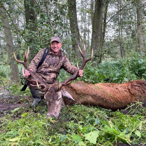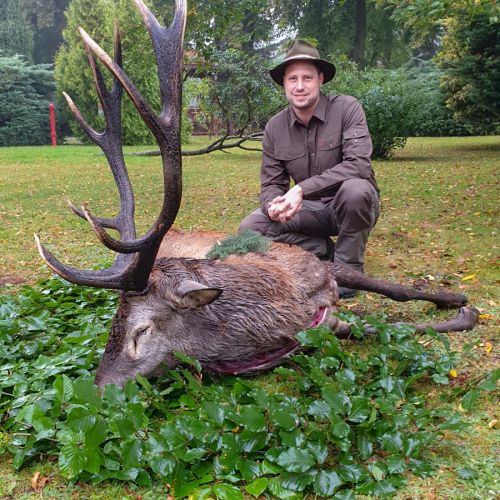 Den 13. september 2020 startede jeg bilen for igen at køre til Milicz. Efter ankomsten til jagthuset hilste jeg på jagtførster Maciej samt nogle jagtvenner fra Münsterland, som jeg har truffet på Milicz tidligere. De havde allerede nedlagt hjort. Der blev hurtigt pakket ud, idet Maciej havde travlt og pressede på for at komme afsted på jagt. Vi kørte ud på en del af reviret, som jeg kendte fra tidligere år, men hvor jeg ikke havde jaget før. Vi tog plads i et lille drivjagtstårn, hvor der kun lige var plads til os begge. Vi er slet ikke for tidligt på plads, for efter ganske kort tid gør Maciej tegn til mig – det er bevægelse i buskadset. Vi kan kun se enderne på geviret, da hjorten kommer gennem terrænet, men pludselig kommer han ud på engen ca. 350 meter væk og står helt frit og brøler. Vi har nu mulighed for at bedømme hjorten – det er en stærk og moden hjort med et stort udlæg. Den prøver at holde sammen på sin rudel og render frem og tilbage, men den kommer ikke tættere på. Så pludselig går alt meget hurtigt – hjorten og hinderne trækker ind i det tætte 2 meter høje buskads og er hele tiden i bevægelse. Hjorten driver hinderne tættere og tættere sammen. Vi kan nu se de øverste ender af geviret. Jeg er klar med riflen og venter på, at hjorten skal komme fri. Den brøler stadig og skifter plads, mens den driver hinderne frem og tilbage. Pludselig – på 175 meter – står han halvvejs fri, og jeg kan lade skuddet gå. Hjorten tegner godt og forsvinder efter 50 meter ind i buskadset. Vores lille tårn vakler en del, også Maciej var blevet ramt af jagtfeberen. Efter en kort og anspændt ventetid forlader vi tårnet for at lede efter hjorten. Det er svært i den tætte bevoksning, men der ligger han! Så står vi der foran den nedlagte kronhjort – en hjort med et udlæg og størrelse som på en wapiti. Vi er overvældede over størrelsen på geviret på den gamle, stærke og modne kronhjort. Vi har nu brug for lidt ro. Jeg tænder en cigaret, mens Maciej henter hjælp til at få bjerget hjorten. Ladt alene tilbage med kronhjorten bliver det langsomt mørkt – det er en herlig aften, vildsvinene trækker forbi mig i vildnisset, og ænderne flyver tilbage til søerne. Efter 1,5 timer kommer Maciej tilbage med Wojtek og Karo – begge betragter hjorten og er begejstrede. Jeg er sikker på, at alle er enige om, at der ligger en særlig stærk brunsthjort. Det er allerede mørkt, men hjorten skal brækkes, bjerges og køres tilbage til jagthuset. Her venter man allerede på os med et stort knæk og bræk, parade, snak og fest. Det bliver en lang aften.