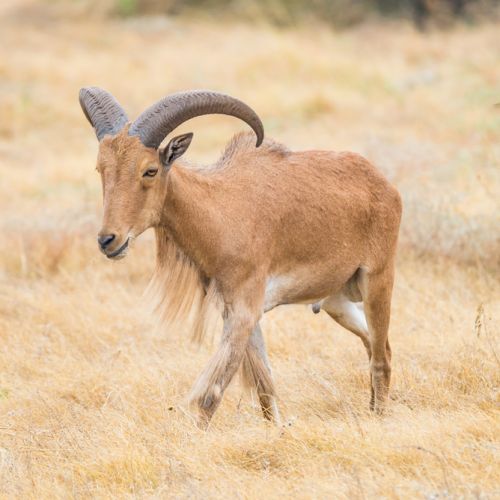 Description: The only African Wild Sheep, peculiar in having some relationshup with the goats, recognised by a short upright mane from neck to middle of back, and a well developed fringe of long soft haairs on the throat, chest and forelegs and hanging like an apron in front of the animal. It weighs around 130 kg and measures around 100 cm over the shoulder. General colour uniform warm sandy brown. The horns are very thick, circular in section, curving evenly upwards and backwards in a semi-circle, appearing almost smooth.