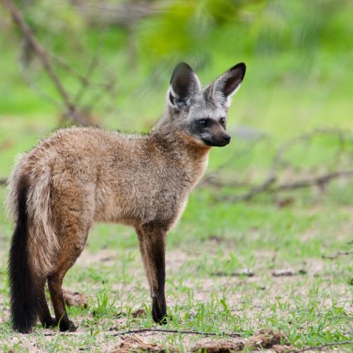 Description: A small, long legged fox, not unlike a jackal. Short muzzle and very large ears, which are white inside, with a black upper edge. Face blackish. Upper-parts a grizzled buff colour, with lighter flanks. Bush tail, blacks above and at the tip.