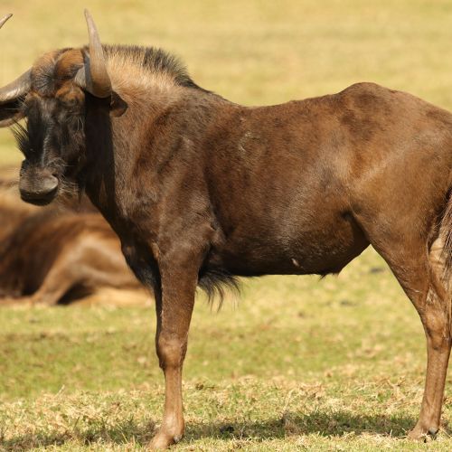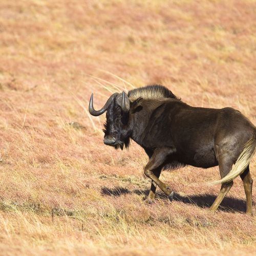 Description: Middle-sized animal of the Gnu-family with a weight of 150 - 170 kg and a shoulder-height of 120 cm. General colour dark brown to jet black and its tail is pure white. A characteristic feature of the White-tailed Gnu is that its face has a large brush-like tuft of stiff hairs pointing upwards, as well as a large and massive mane, the latter often leading to mistaken estimations as to the height of the animal.