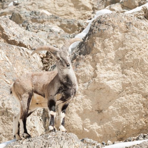 Description: Taxonomically a so called "half sheep", related to both sheep and goat. The name is derived from the colour of the first wintercoat of the young males that has a blueish tinge. In older males the winter coat is light brown/grey with black markings bordering the white underparts, back of the legs and throat. The horns are heavy, slightly ridged, bending sideways then turned backwards. The Blue Sheep weighs up to 80 kg (Dwarf Bharal only 40 kg), measuring up to 90 cm over the shoulder. At this size it reaches a total body length of 1.40 m without tail (20 cm).