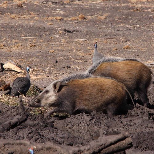 Description: A domestic pig-like animal, weighing around 100 kg and measuring 70 cm over the shoulder. It has a compact body and long, thin legs. Coat long and bristly with a long dorsal whitish crest, erected when the animal is excited. General colour reddish brown to bright rufous or dark grey to brownish black. The ears have terminal tassels of long hairs, characteristic to the species. The tusks are very sharp, but short, looking a bit like those of the European Wild Boar.