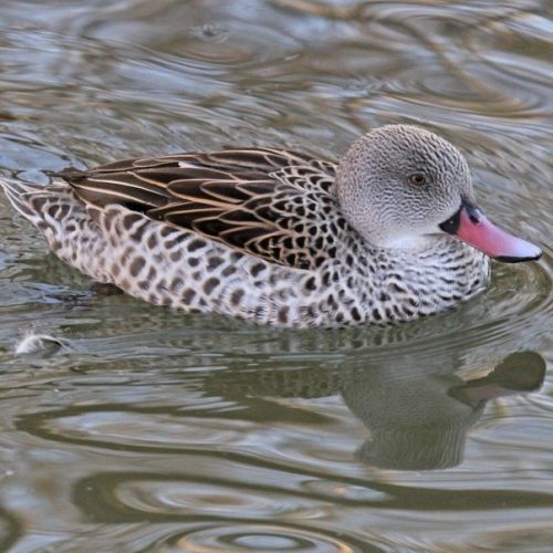 Description: The Cape Teal is similar to the Redbilled Teal in appearance. It is light grey with light spots and marks over its back. It can be be identified by its pink bill and reddish eyes. It is a fast flying duck, that will present a challenge to any hunter.