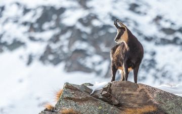 Description: Middle sized animal of the goat family with a compact body and long, strong legs. The Chamois weighs around 50 kg, and measures up to 70 cm over the shoulder. General colour yellowish brown in summer and dark brown to almost black in winter. In older individuals the colour in winter may be greyish black. The Chamois has characteristic white markings on the head. The horns are fairly long, upright and bend back in shape of hook with distinct knobs throughout their length. Both sexes have horns but the male Chamois carries the biggest.
