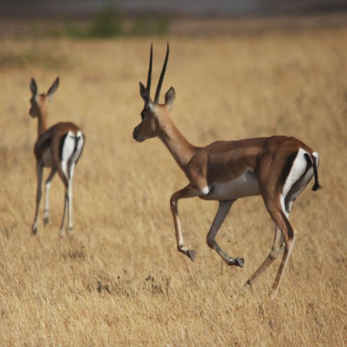 Description: Medium sized antelope weighing up to 50 kg and measuring up to 90 cm over the shoulder. It reaches a total body length of 1,40 m without tail (10 cm). The antlers are straight and narrow, pointing almost straightly upwards, ridged througout their length.