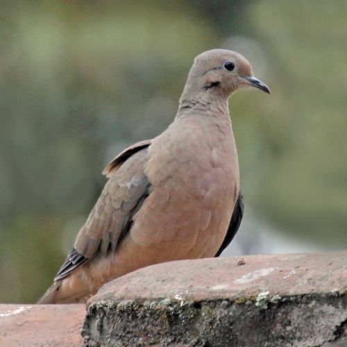 Description: A medium-sized dove, 24cm in length, with a long wedge shaped tail. Adult males have olive-brown upper parts, with black spots on the wings. The head has a grey crown. Its English name comes from the black line behind its eye and its blue-black lower ear coverts. Underparts are pinkish grey and the tail is tipped with cinnamon. Black bill, dark red legs. The females are duller in colour.