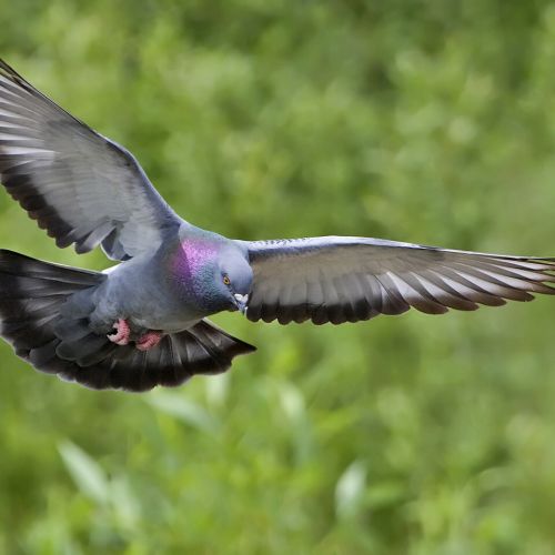 Description: Adult rock doves are 29 - 37cm in length. It has a dark blue/grey head, neck and chest with patches of iridescent purple and green on the side of the neck. The bill is grey and its feet are purplish red. The eye has an orange iris. It can be distinguished from feral pigeons by its white rump and two black wingbars.