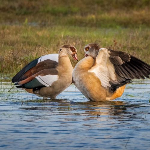 Description: Its plumage can vary between different shades of brown and grey, it has a brown mask , a bark patch on its belly and large areas of white on its wings, that are most clearly seen in flight. It has long pale red legs. The Egyptian goose has a body weight of around 2.5cm and a wingspan of up to 1.4 meters. It is one of the most challenging birds to hunt in South Africa.