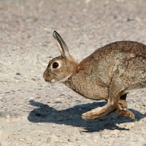 Description: Smallish grey brown mammal with long ears, large hind legs and feet, and short fluffy tails. Ranges between 34 - 50cm in length(plus tail of 4 -8cm) and 1.1 to 2.5kg in weight.