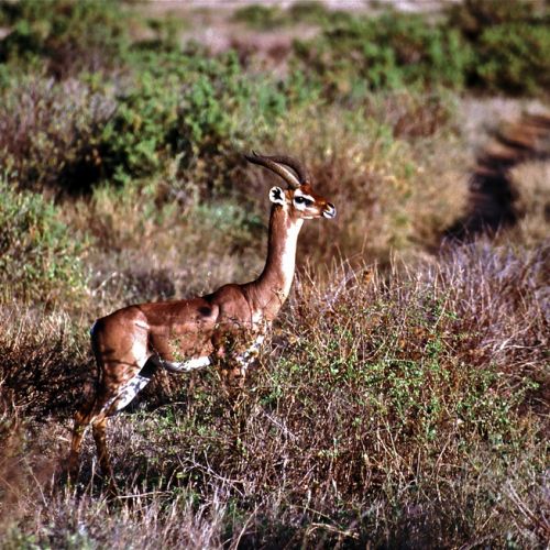 Description: A large gazelle, with an exceptionally long neck (hence its common name: Giraf-gazelle). General colour ruddy brown with the upper back distinctly darker, contrasting with lighter sides. The Gerenuk weighs around 35 - 50 kg. and measures around 100 cm over the shoulder.