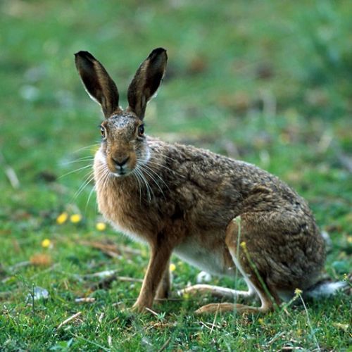 Description: A large member of the rabbit family, with a body length of between 60 -75 cm and a weight of 3 - 5 kg. Long ears up to 11cm in length. Its fur is grizzled yellow-brown in colour, more rufous on its shoulders, neck, legs and throat. Underside white. Black tail and ear tips.