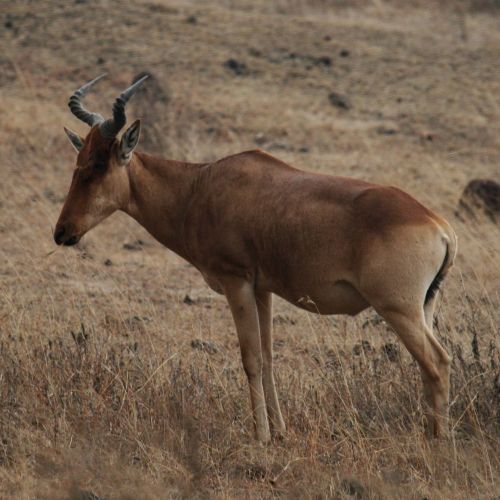 Description: Middlesized antelope that weighs around 170 kg and measures 120 - 140 cm over the shoulder. Back bright rufous contrasting with the pale fawn flanks and the whitish hindquarters. The horns are short, flattened and thick at their base, strongly ridged with a double curvature, first outwards then upwards and inwards, finally backwards their terminal portions nearly parallel. ( The curves of Lichtenstein's hartebeest are the most markedly unique amongst the hartebeest's.).