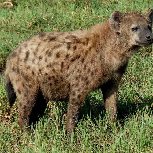 Description: Medium-sized dog like animal with a compact body and strong legs. It achieves a weight of about 70 kg. and a height of 80 cm. mesuared across the shoulders. The head is broad and snout short. Metasome is somewhat lower than the front body which helps to give the animal suck a characteristic appearance. The coat is short and light brown with dark brown spots. Hyenas are mainly scavengers which are able to eat and digest contaminated meat. It is rarely that the hyenas resign their prey themselves. Hyenas are able to crush even very large bones with their powerful jaws.