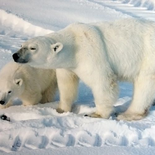 Description: Very large Bear, weighing up to 720 kg and measuring around 1,60 m over the shoulder. The colour ranges from creamy white over yellow/grey to almost brown, according to season and light conditions. Erect the Polar Bear may reach a height of 2,50 meters.
