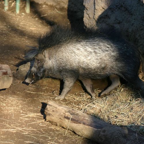 Description: Large pig weighing up to 185 kg and measuring up to 80 cm over the shoulder. It may reach a total body length of up to 160 cm. General colour greyish brown to almost black. The sides of the cheeks have beardlike hairs. The male has prolonged canines.