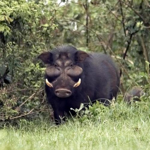 Description: A huge pig, reminiscent of a wild boar, heavily built, with an elongated body, relatively long limps, the rump being higher than the shoulder. It weighs around 275 kg and measures 100 cm over the shoulder. Skin blackish-grey to jet black, with bristles standing nearly erect on the back of the head and neck. Large swollen excrescences below the eyes and tushes protruding from the mouth, smaller than those of the Warthog.