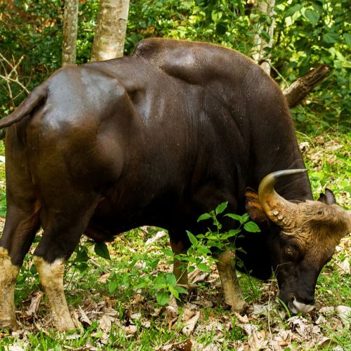 Description: Large wild cattle weighing up to 900 kg and measuring up to 190 cm over the shoulder. It may reach a total body length of 2,20 m. General colour blackish brown. The horns are heavy, upwards, forwards and outwards pointing. This species was not discovered untill 1936.