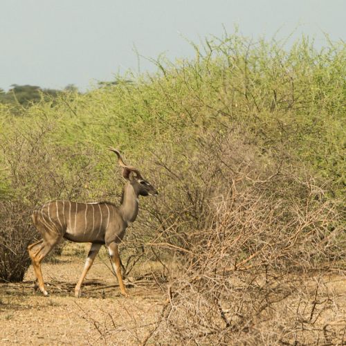 Description: Looks much like the Greater Kudu, but has got a shoulderheight of 100 cm and an average weight of 90 - 100 kg. However, Lesser Kudu has more white side stripes than its larger cousin (Greater Kudu ca. 7, Lesser ca. 9)