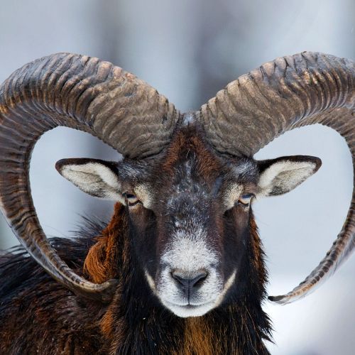 Description: The smallest of the wild sheep, the Moufflon weighs around 60 kg. It measures up to 80 cm over the shoulder. General colour dark brown, underparts and rump white. Black markings in the transition between dark brown and white. In winter the ram has a distinct, greyish white "saddle". Mature male horns curl in almost one full revolution (up to 85 cm). The female has smaller horns.