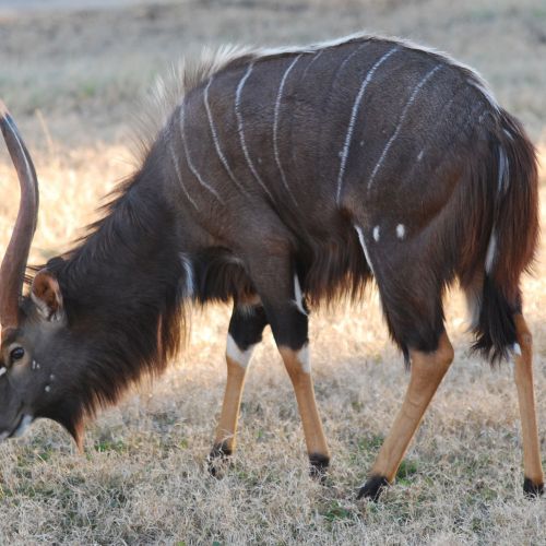 Description: Middlesized anthelope of 110 - 130 kg and a shoulderheight of 110 - 120 cm. General colour dark slaty brown with a purplish tinge, with white and lightbrown markings. The Nyala has ca. 11 white stripes down the side of the body and are characterized by a shaggy coat enormously developed on the underside from the chin to the hind legs. Furthermore, it has, like many of the other Tragelaphus' a crest of hair that continues down the spine. The horns are reminiscent of the ------- (only thinner) and usually have a single open curve.