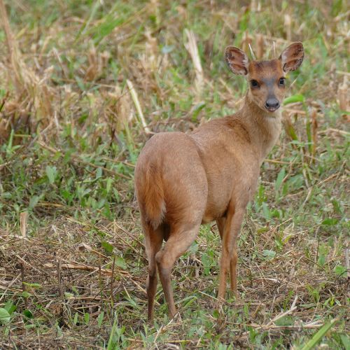 Description: Medium sized deer (almost the size of the Roe-deer), weighing up to 21 kg. It measures around 70 cm over the shoulder and reaches a total body length of 1,30 m, without tail. The antlers are small and pointed.