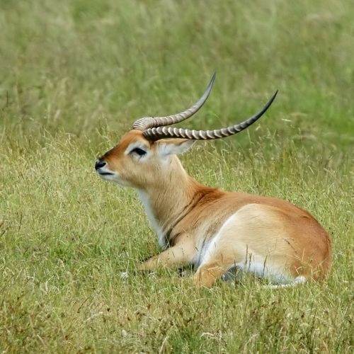 Description: The tree species will be described as one as the difference between them is negligent: Middlesized antelope that reaches a weight of 120 kg and a shoulder height of 90 - 100 cm. General colour either bright chestnut fulvous with white markings on head and neck. Black Lechwe is more blackish brown in colour on the neck, back and sides. Kafue Lechwe has dark shoulder patches. The horns are reminiscent of Buffon Kobens, but are somewhat heavier and longer.