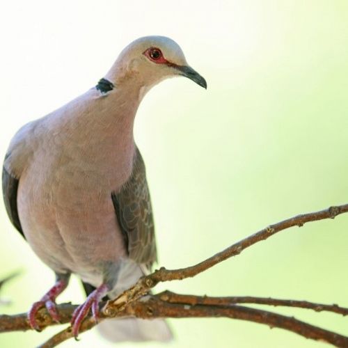 Description: It has a grey/pink body with orange/red eyes and has a ring of bare skin around the eye. The back, wings and tail are light brown in coloured the face is light grey. Its small size and fast flight make it very exciting to hunt.