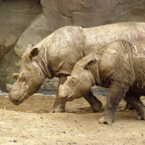 Description: The smallest of the Rinoceros', weighing up to 800 kg and measuring up to 1,40 m over the shoulder. It may reach a total body length of 3,15 m without tail (40 cm). This rhino develops two horns, the hind one being not very distinct.