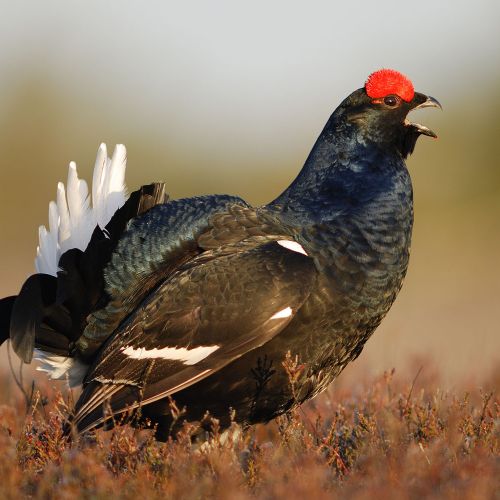 Description: Large member of the grouse family. The males and females an be easily distinguished by their size and colouration. Males all black apart from red wattles and a white wing bar. Distinctive lyre-shaped tail. 51 - 56cm in length, 1 - 1.5 kg in weight. The hens are smaller, 40 -44 cm in length and 0.75 -1.1 kg in weight. Heavily barred brown and black above, black and buff below.