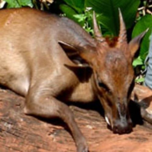 Description: Small antelope with a weight of around 20 kg and a shoulder height of 50 - 60 cm. General colour brownish fawn merging to bright rufous posteriorly. Has the characteristic crest of hair between the horns (not as long as some of the other Duikers').