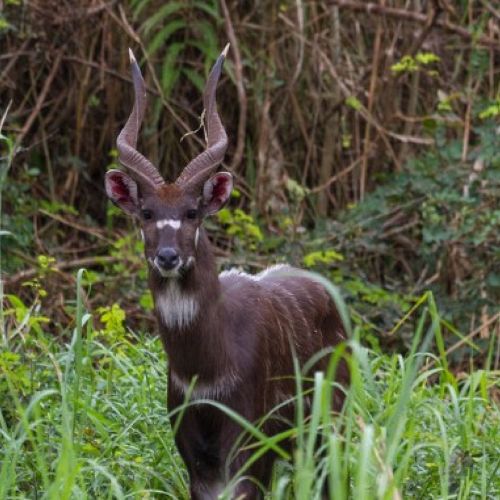 Beskrivelse: Forest Sitatunga er en mindre, elegant antilope med lang benbygning og en slank krop, der gør den i stand til at bevæge sig gennem mudrede og sumpede områder. Hannerne har horn, der spiraler sig udad, mens hunnerne normalt er hornløse. Pelsen er rødbrun til gråbrun med markante hvide striber og pletter på kroppen, hvilket giver den effektiv camouflage i dens naturlige habitat. Dens ben er ofte delvist hvide og ringede.