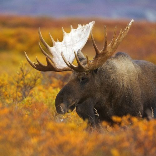 Description: Massive, Roman-nosed deer with large pendulous upper lip and hairy nosepad, the Moose weighs up to 800 kg and measures around 2,30 m over the shoulder, reaching a total body length of 3,50 meters. The coat is coarse, greyish-brown, the legs being lighter, greyish-white. The adult male has a beard. The antlers are often palmate with several points.
