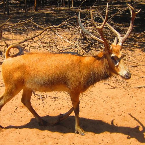 Description: Large deer weighing around 250-300 kg and measuring up to 125 cm over the shoulder. General colour greyish brown summer and winter. The antlers are heavily and irregularly branched.