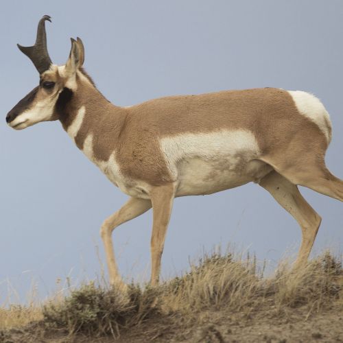 Description: Middle-sized antelope-like animal weighing around 70 kg and measuring up to 1 m over the shoulder, reaching a total body length of around 1 meter. General colour pale fawn, flanks and underparts white, white rump. Brown cheeks, dark bridge of the nose, dark spot above the eyes, otherwise pale head. The horns bend slightly inwards, with one point pointing forwards. The horns are shed at their base once a year, and grow anew, this feature is unique amongst the Bovides.