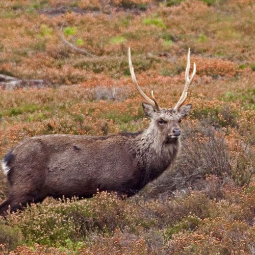 Description: Medium sized der weighing around 100-130 kg and measuring up to110 cm over the shoulder. General colour brown with distinct white spots in summer, greyish brown without white spots in winter. The antlers of C. nippon has up to 8 points whereas it is not unusual to find antlers on C. nippon manchuricus with 10 points or more. The Sika has been introduced to Europe from Asia. The Sika is unpopular in many woodland districts in Europe because of the damage it causes.
