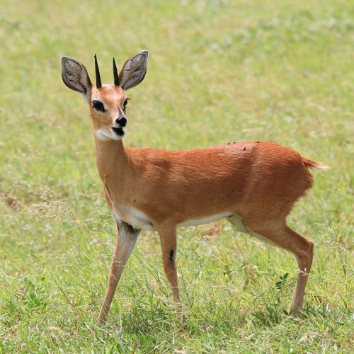 Description: Small antelope weighing 10 - 15 kg with a shoulder height normally not above 60 cm. The Steenbok i uniform bright rufous fawn with white markings over the eyes and on the throat. The horns are straight and very sharp, smooth, slightly curved forwards and having narrow ridges.