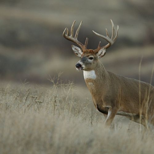 Description: Medium sized new world deer weighing around 140 kg. It measures up to 1,10 m over the shoulder and reaches a total body length of 2,40 m, without tail. General colour rufous brown in summer, bluish grey in winter. The underparts and rump white, tail broad and dark above, white below. The main beam of the antlers slides backwards, then abruptly forwards, with erect branches on hind margin.