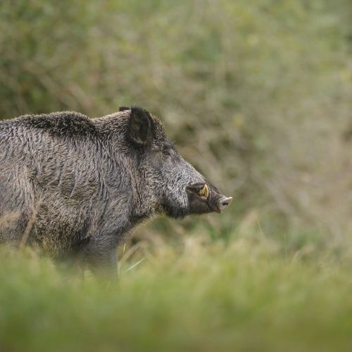 Description: Large pig, with a compact body and short stocky legs. It weighs up to 300 kg and measures up to 120 cm over the shoulder. Reaches a total body length of max 180 cm. Dark, bristly pelage. Upwardly pointing upper canine tusks in male only. Summer coat of bristly guard hairs, relatively long and dense, winter coat dense, longer hair, with thick underfur. The tusks of the male have life long growth.