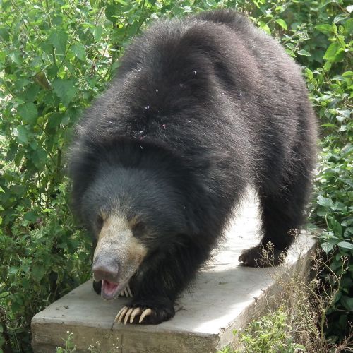 Description: Medium sized bear weighing up to 115 kg and measuring up to 90 cm over the shoulder. It reaches a total body length of 2,0 m without tail (12 cm). General colour black with white patches on the chest and a white nose. Manelike hairs on the shoulders and neck.