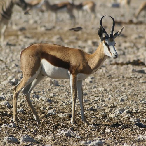 Habitat: Open dry plains and semi-desert. Small gazelle with relatively long legs. The Springbok reaches ca. 95 in height and has an average weight of 25 - 45 kg. General colour bright rufous fawn.
