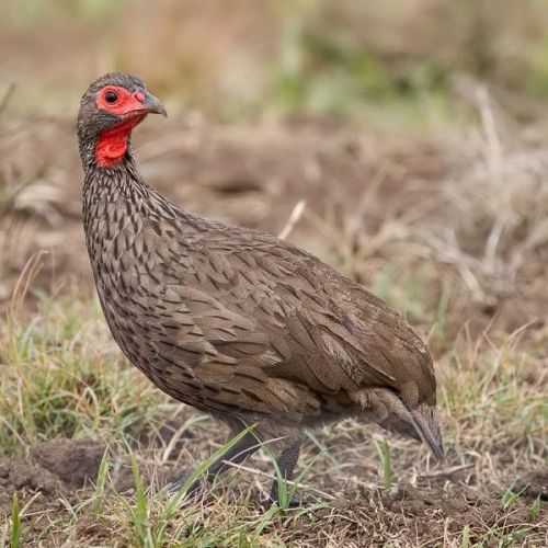 Description: It is brown with a characteristic red head and it is very popular with hunters as it is a strong, fast flier. It is similar in appearance to the Cape francolin, but does not live in the same areas. It usually occurs in small flocks of 8 - 10 birds.