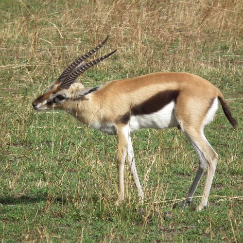 Description: Small gazelle with a shoulder height of 70 cm and a weight of 20 - 30 kg. General colour deep sandy fawn, broad and sharply defined black lateral band in direct contrast with white underparts. The horns are slightly divergent, evenly and strongly curved backwards, with tips recurved upwards.