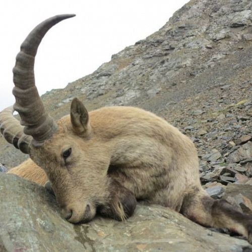 Description: Wild goat weighing up to 100 kg and measuring up to 1 meter over the shoulder. It reaches a total body length of 1,40 m without tail (15 cm). General colour yellowish brown. The horns are large, heavily built, ridged. They point upwards, outwards, then backwards, downwards and inwards. The horns are similar to those of the Alpine Ibexes.
